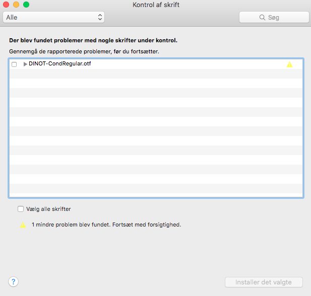Hvis der nu fremkommer et vindue med overskriften “Kontrol af skrift”, hvor der står, at der er et problem med skriften, så lad være med at installere den, men bare luk vinduet på det røde kryds i øverste venstre hjørne: