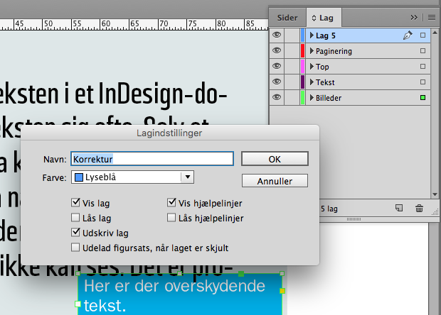 Det gør det lidt uoverskueligt, og din boks er sværere at få ved, hvis du vil flytte den lidt, eller hvis kunden vil slette den. Læg den derfor altid oven på alle andre elementer (tekst og billleder) i dokumentet, gerne i et særligt lag. Det gør du således: